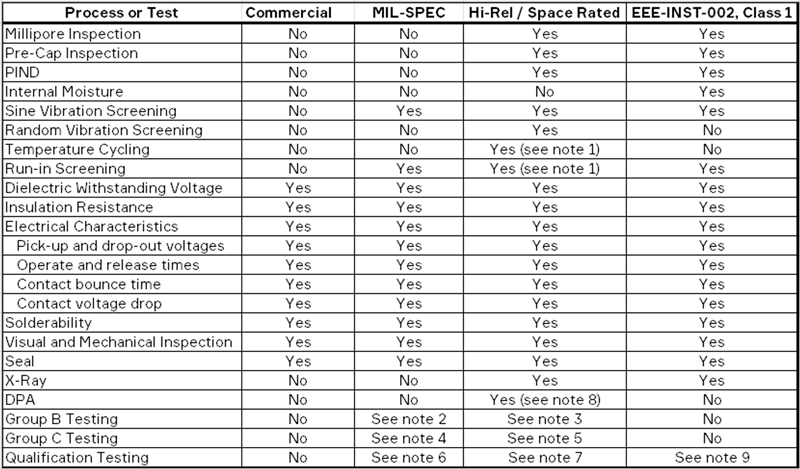 Note 1- Leach Space COTS relays receive five thermal cycles with run-in screening conducted on the fifth cycle.