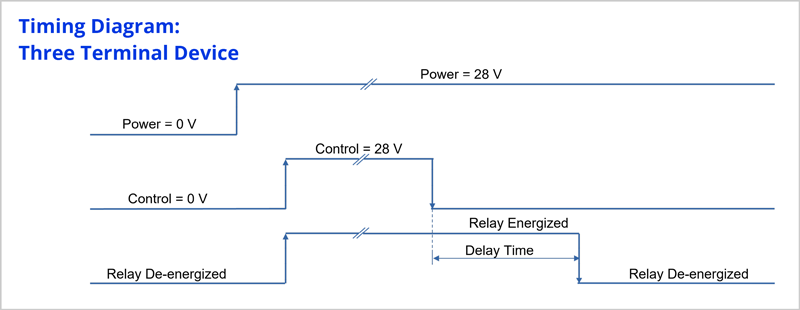 In the two terminal version, sometimes called “true time delay”, when power is applied the integral relay immediately energizes and stays energized. Subsequently when the power is removed (i.e. released), the integral relay de-energizes after lapse of the specified time.